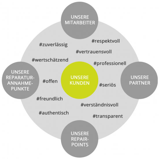 Im PRO REPAIR-Kosmos interagieren wir mit unseren Partnern, Beschäftigten und Kunden auf Augenhöhe. Dabei ist es für uns selbstverständlich, unsere Werte nicht nur zu beschreiben, sondern täglich zu leben.